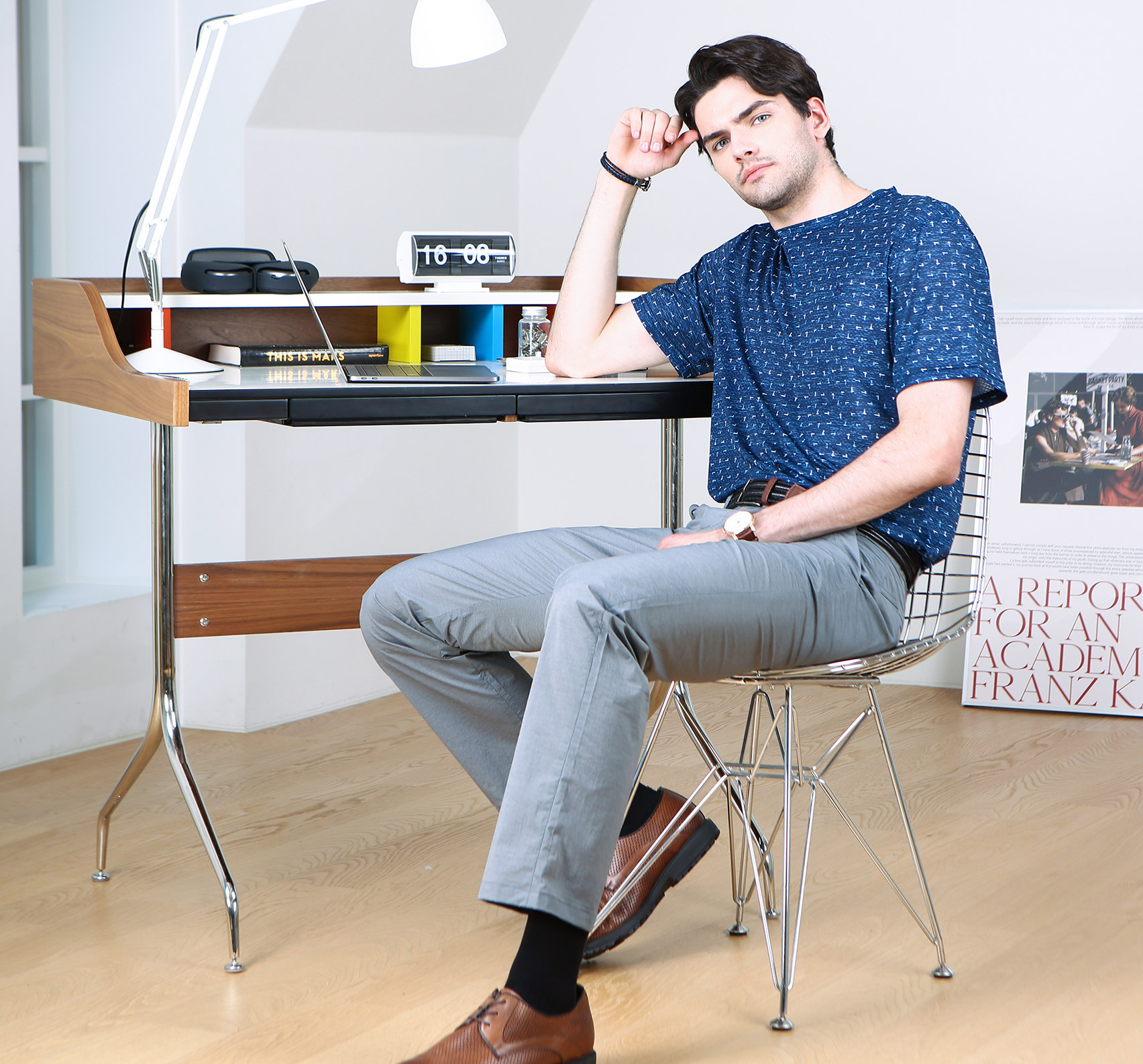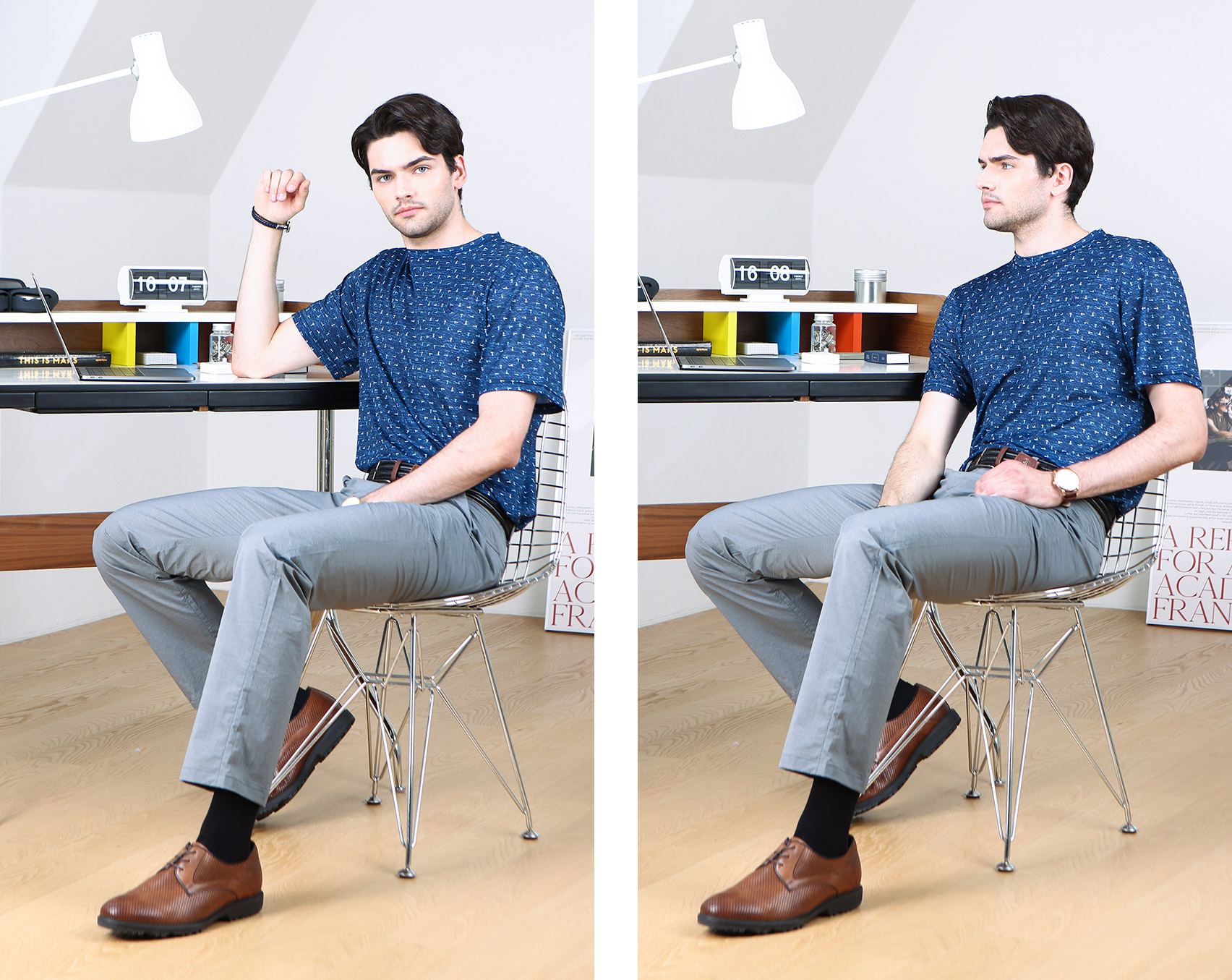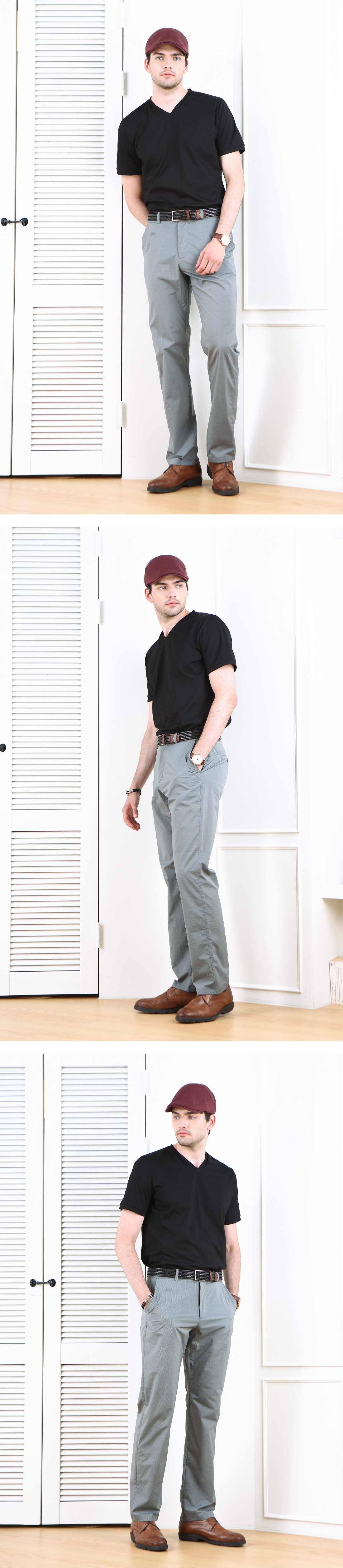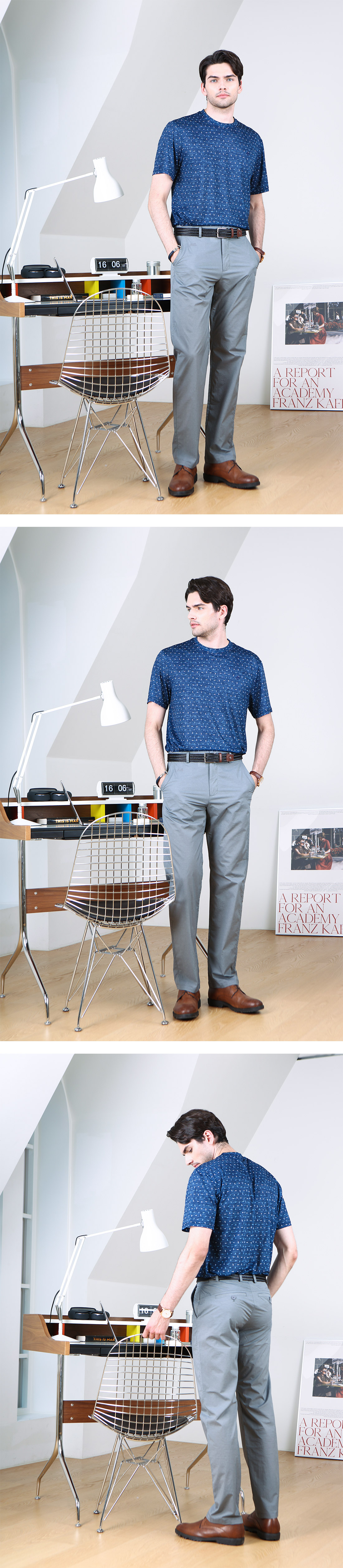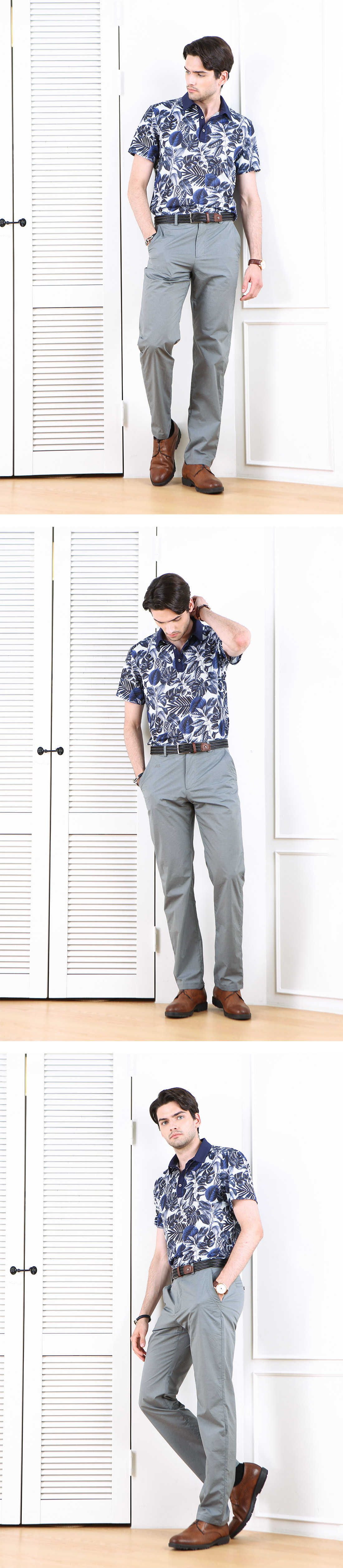 여름철에 맞춰 색상은 차분한 네이비, 그레이, 카키 색으로 가되 톤과 채도는 조금 낮춘 옅은 컬러감이다. 더워 보이지 않고 사각사각한 촉감이 전해지는 경쾌한 톤의 컬러이다.