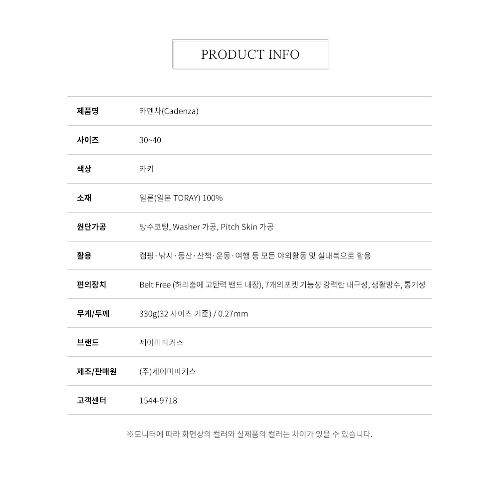 카덴차 바지는 7개의 다양한 포켓을 갖추고 있어, 여러 소지품을 효율적으로 보관할 수 있습니다. 캠핑, 낚시, 등산 등 야외활동 중에도 필요한 물건들을 손쉽게 꺼내 쓸 수 있어 매우 편리합니다. 이런 세심한 디자인 덕분에 아웃도어 활동 외 일상적인 활동에서도 유용하게 사용할 수 있습니다.