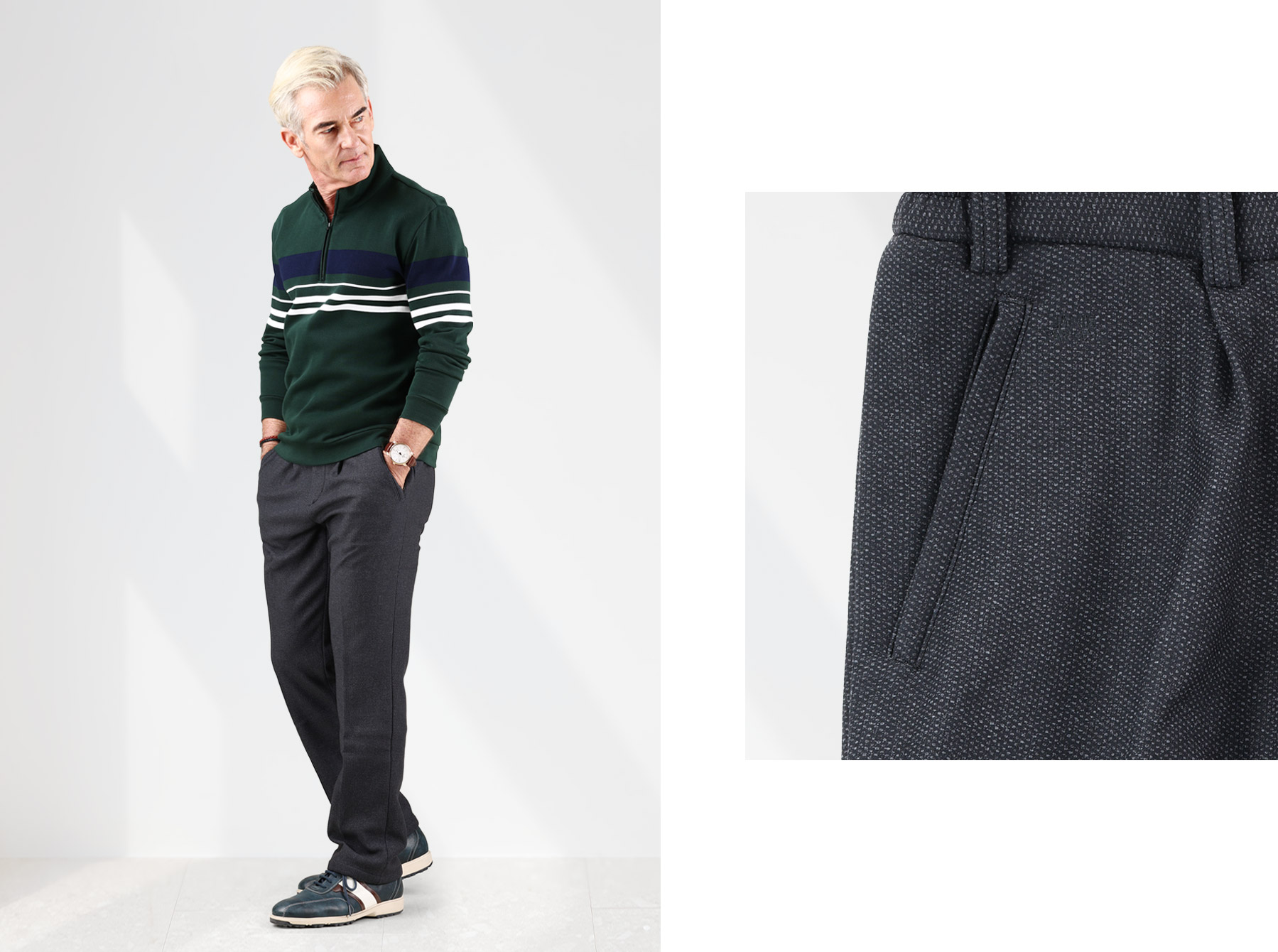 팬츠의 외형은 클래식한 영국식 정장팬츠를 기반으로 한 단정한 디자인이지만, 허리부터 밑단까지 부드럽게 늘어나는 뛰어난 신축성을 자랑합니다. 걷고, 앉고, 계단을 오를 때에도 움직임을 자연스럽게 따라가며, 실내에서도 답답함이 없고 외출 시에도 깔끔한 라인을 유지합니다. 한 벌로 출근복, 일상복, 여행복까지 완벽히 소화할 수 있습니다.