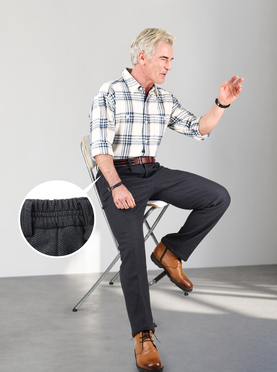팬츠 전체가 완벽한 유연성을 가진 원단으로, 움직임이나 체형 변화에도 항상 안정적이고 편안한 착용감을 제공합니다. 옆구리 허릿단에는 약 4-5cm의 고탄성 밴딩 처리를 하여 벨트 없이도 자연스럽게 착 감기며, 식사 전후나 장시간 착용해도 압박감이 전혀 없어 편하게 입을 수 있습니다.